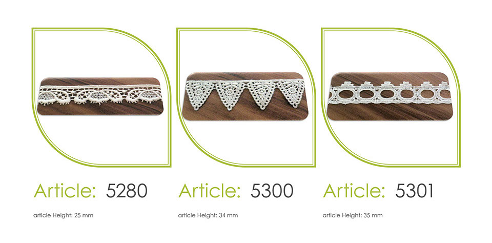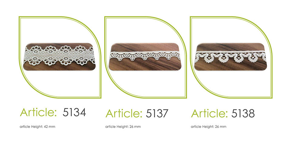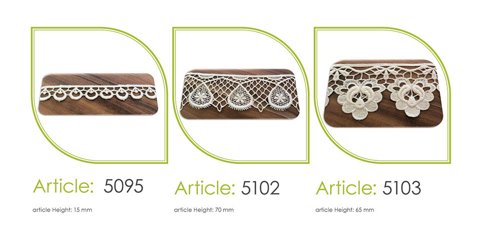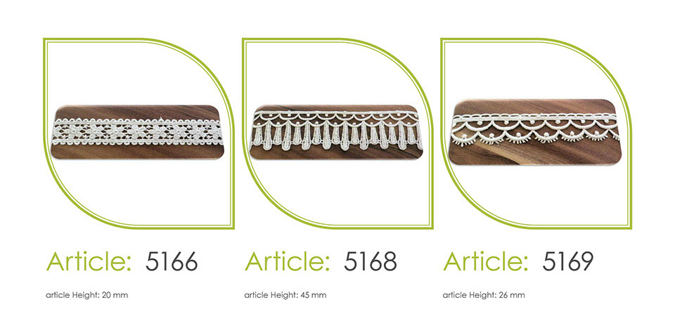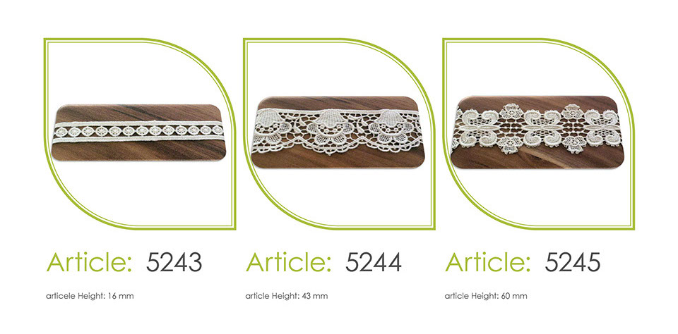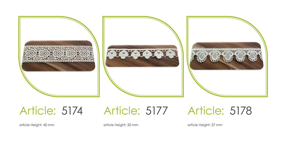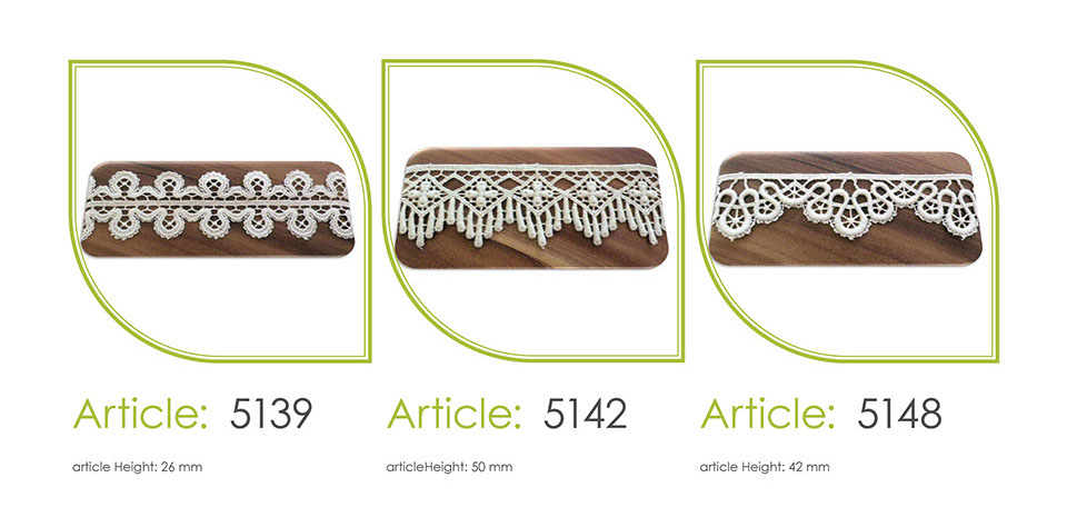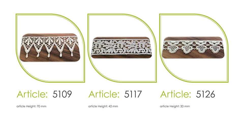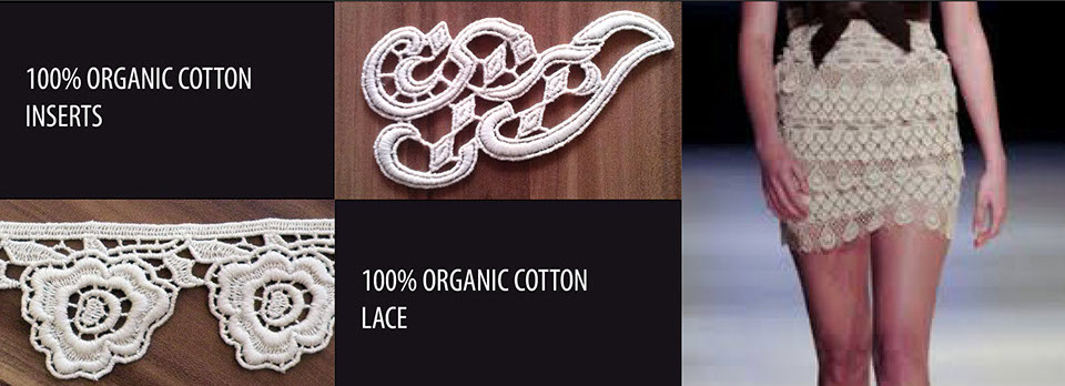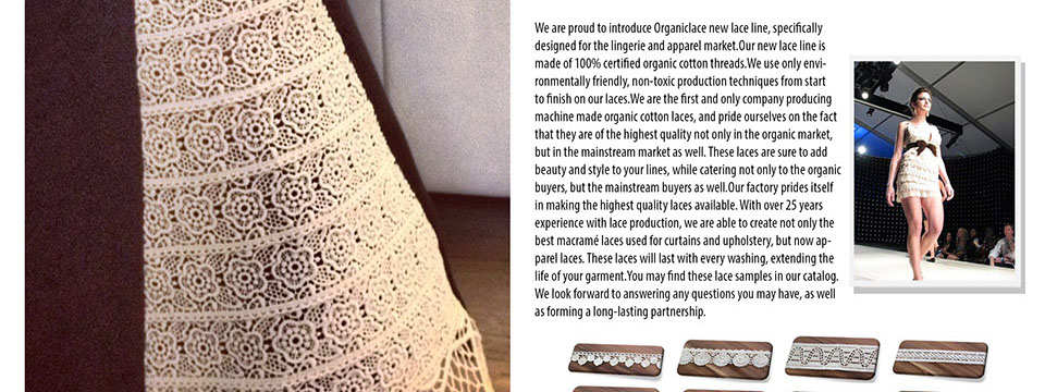 ORGANICLACE We are proud to introduce Organiclace line specially designed for underwear and garments. Our new line of organiclace is made from 100% certified organic cotton. Is especially environmentally friendly, non-toxic manufacturing technology, from start to finish of making organiclace. These organiclace are sure to add beauty and style to your products, not only for organic buyers, but mainstream buyers as well. Our manufacture is famous for that it offers the customer the highest quality of organiclace. With over 25 years of experience in the production of lace, we are able to create not only the best Macrame lace, used for curtains and upholstery, but also organiclace for garments. These laces extend the life of your garments after every wash.