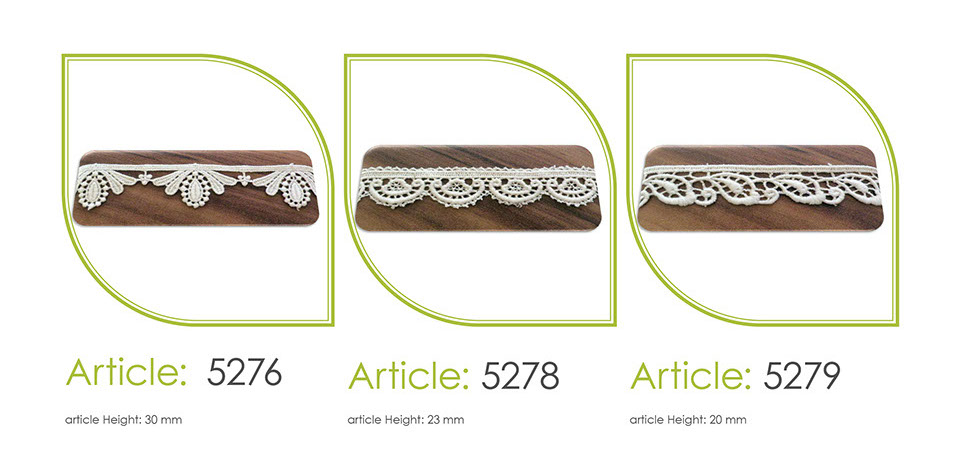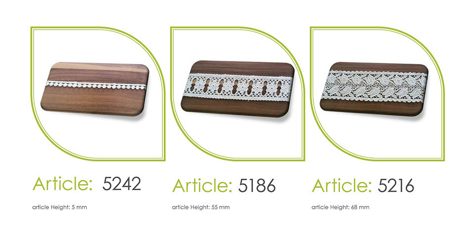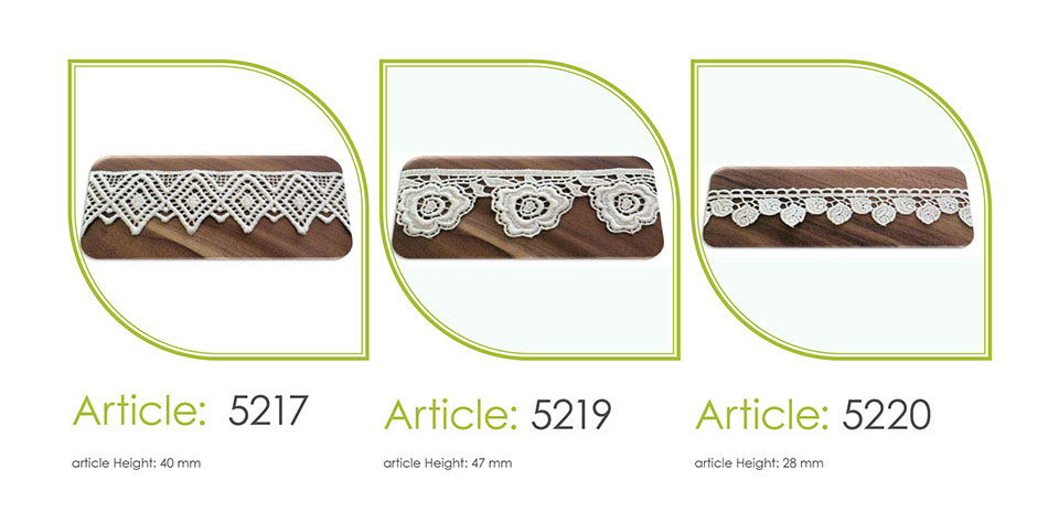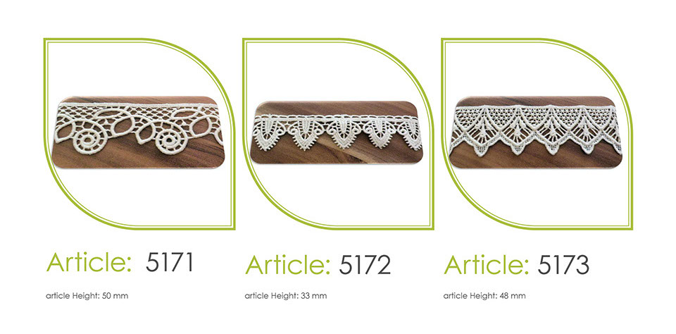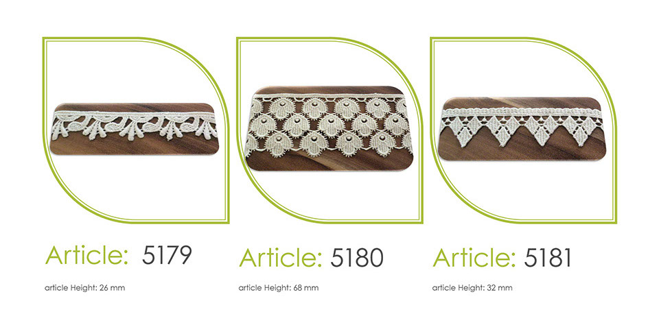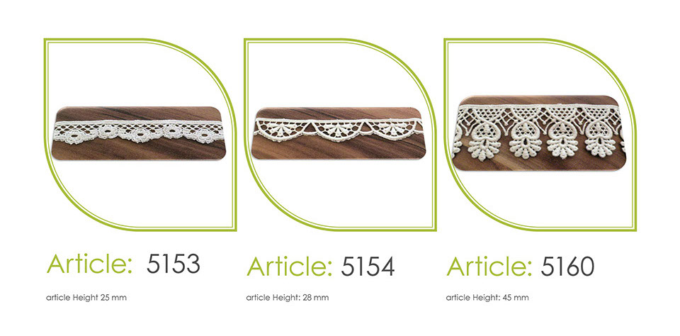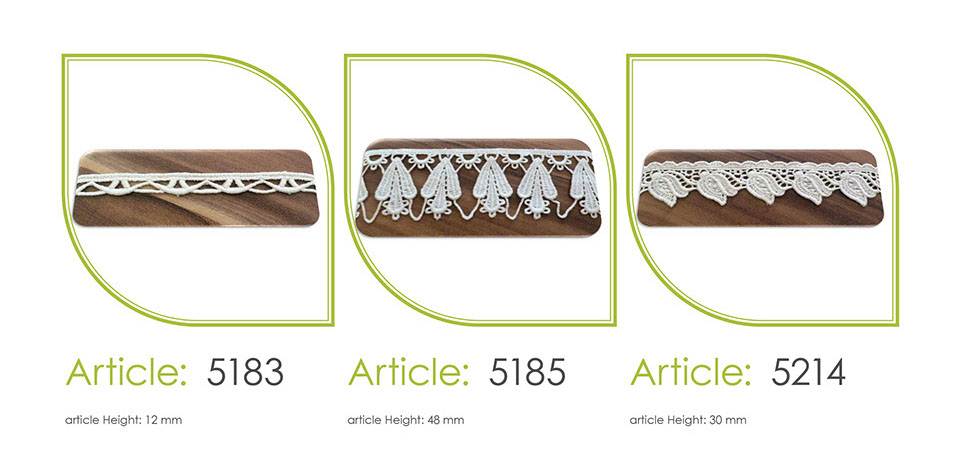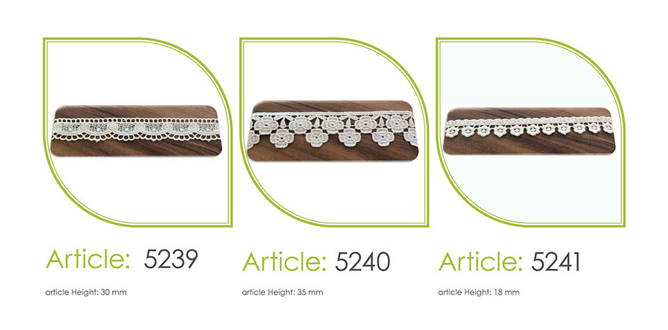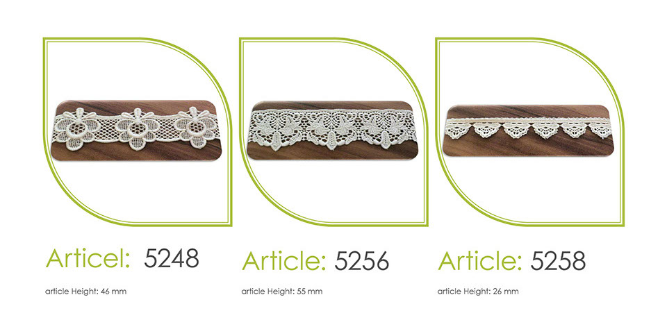 ORGANICLACE We are proud to introduce Organiclace line specially designed for underwear and garments. Our new line of organiclace is made from 100% certified organic cotton. Is especially environmentally friendly, non-toxic manufacturing technology, from start to finish of making organiclace. These organiclace are sure to add beauty and style to your products, not only for organic buyers, but mainstream buyers as well. Our manufacture is famous for that it offers the customer the highest quality of organiclace. With over 25 years of experience in the production of lace, we are able to create not only the best Macrame lace, used for curtains and upholstery, but also organiclace for garments. These laces extend the life of your garments after every wash.